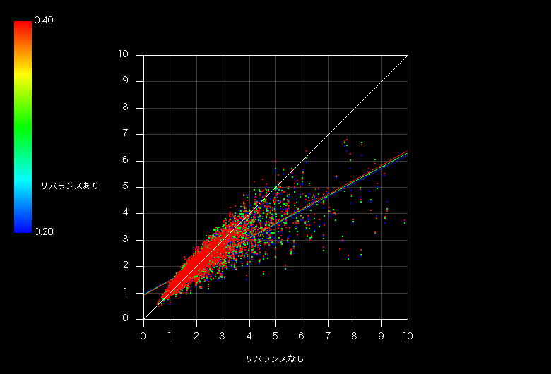 共分散に要素ごとの差がある場合、最小シグマ(最小消失リターン)を満たすウェイトは共分散行列に応じて偏りが生じます。また相乗平均最大も共分散の他に相加平均に応じてウェイトが変化します(このグラフは2資産とも相加平均ゼロとしているため消失リターンを表し、極値ウェイトは最小シグマと同じ)。しかしリバランスボーナスは少なくとも2資産の場合に常に均等配分が最大を満たすことがわかっています。個人的にはリバボのこの特性が特異でありおもしろいと感じる部分です。