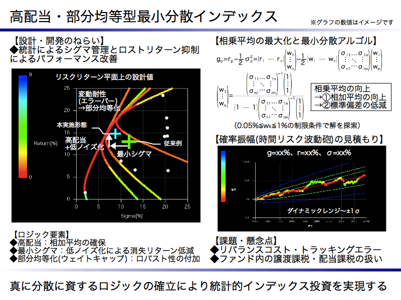 これまでのインデックスファンド/ETFも発表の時にいろいろ資料は作成されていますが、多くは過去の実績(時系列でリターンがTOPIXに対してどうかとか)がメインなので、どうせなら設計思想やアルゴルを数式やグラフを用いてもっとマニアックかつ定量的に記述していただければよいのではないかと思います。むしろそれくらいしないと統計インデックスの意図や本質を伝えることはできないのではないでしょうか。