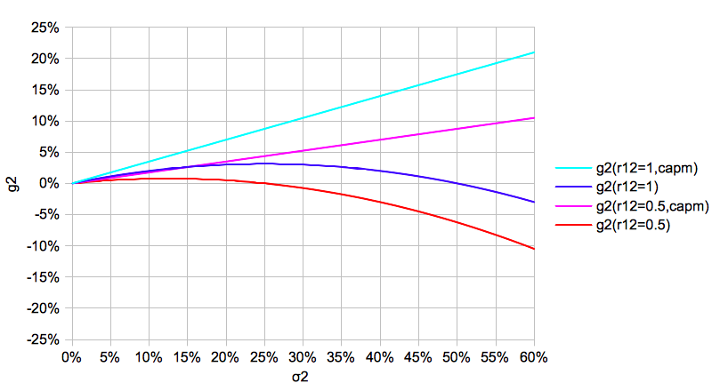上のグラフはRf=0、σ1=20%(market)と置いた時の相乗平均g2の振舞いです。数学的にリターンと「ベータ」との関係は示すことができ、シグマが存在すれば相乗平均SRが低下し非効率であることが示せると考えています(シャープレシオ「g2/σ2」をσ2で微分すると負のコンスタント(単調減少)になるため)。