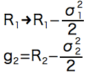 ちなみに共分散によらない一般の「リターンを蝕むリスク(シグマによる相乗平均の減価)」タイプの法則は以下のようになります。