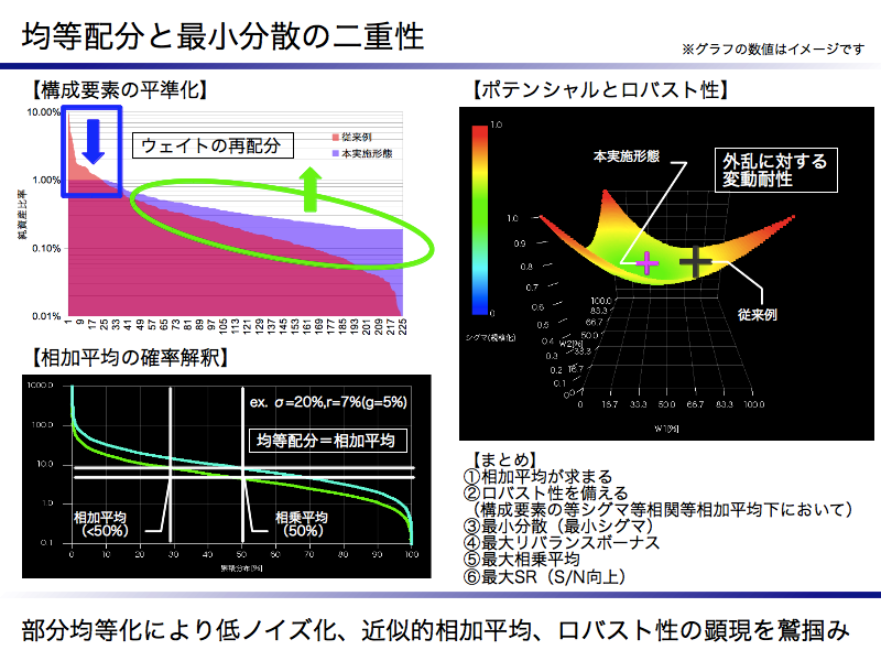 スライドの左下の図が上記①の相加平均であることを示します。複利(対数正規分布)において中央値は相乗平均、平均値は相加平均となります。相加平均は確率で50%以下のマイノリティです。イコールウェイトは相加平均そのものなので確率を無視して平均値を実現できると考えています。