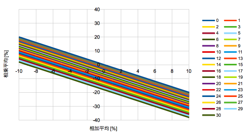 単位時間あたりの変動率にゲインをかけるレバレッジ/インバース型は相乗平均の減価も加速されます(標準偏差がゲイン倍されゲインの自乗で相乗平均が消失する)。この特性により、レバレッジ/インバース型は通常の指数より激しく減価していきます。また期待値をプラスに仮定するインデックス投資ではインバース型は定常的に減価していくことになります。