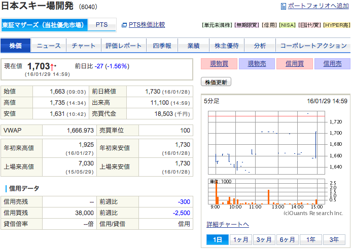 残念ながら温暖化がバラツキを持ちながら進行していくと仮定するとスキー場の場合は長期保有の観点からは自重したいのがほんとのところ。ただ八方尾根はよく行くので株主優待(リフト券割引)があるなら分割後10万円くらいなら買ってもよいかしらと思えます。でも日本スキー場開発は今のところ配当がないんですよね。