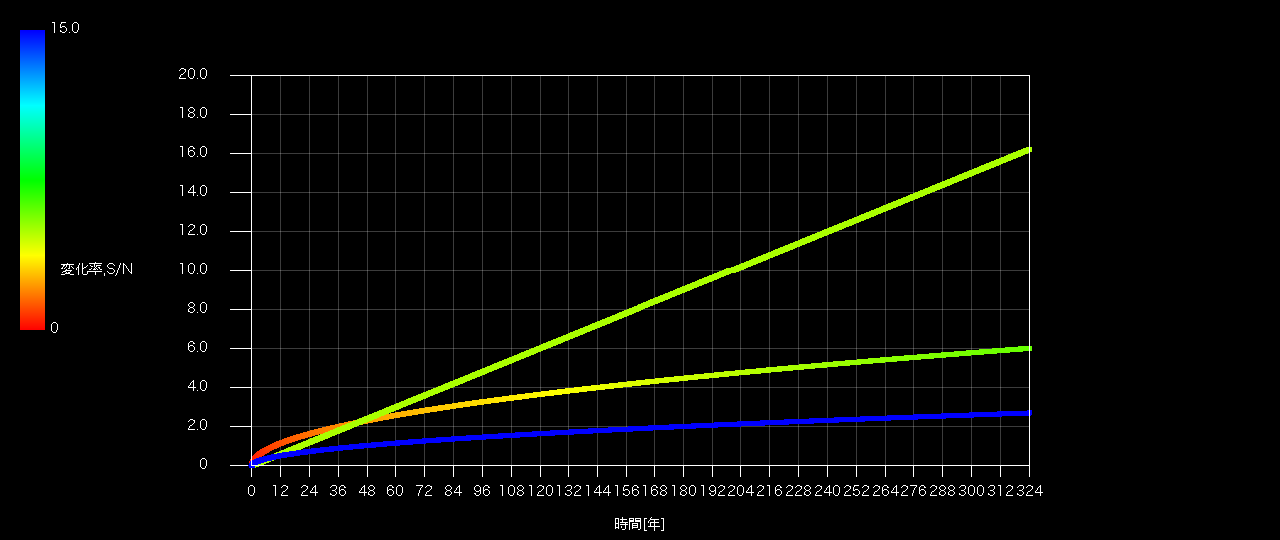 黄緑色の直線が累積リターン、青い曲線が累積リスク、色の変化している曲線がS/Nを示しています。