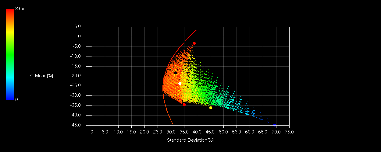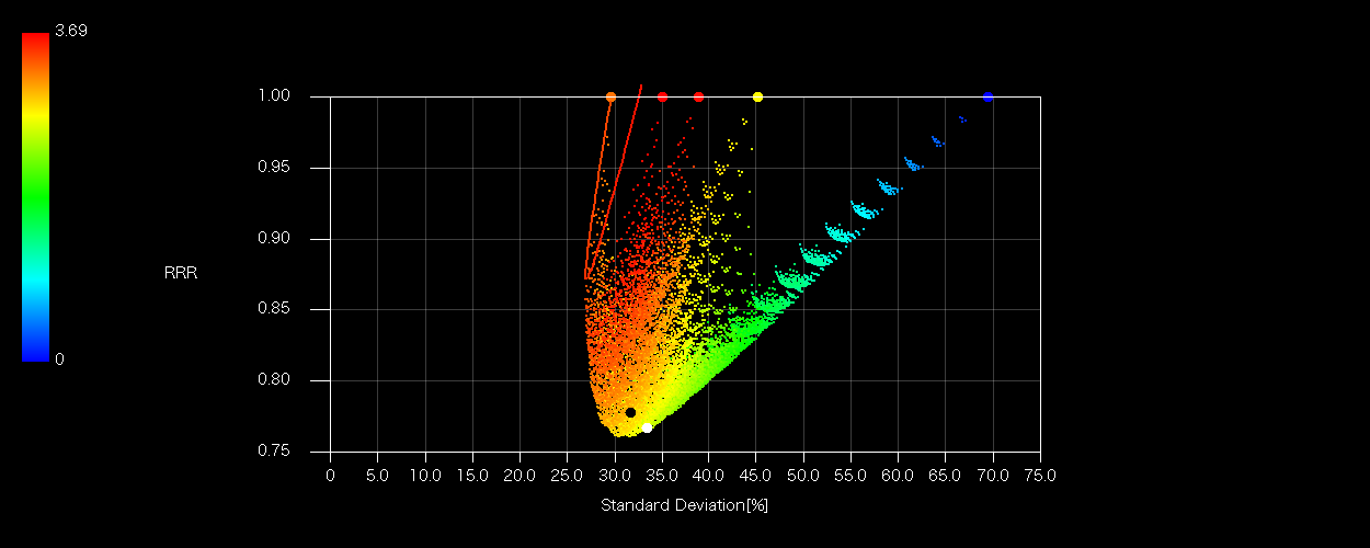 各プロットのX軸はシグマ(標準偏差)、Z軸(色)は加重平均配当利回り、ラインは全要素の有効フロンティア、ドットは5%ピッチSOBOLシーケンスによる総当たりマトリクスであり、組み合わせの数は5H20=24C20=10626通り。ドットに埋もれてしまうので均等配分(白丸)、加重配分(黒丸)は配当によらず色を変えています。
