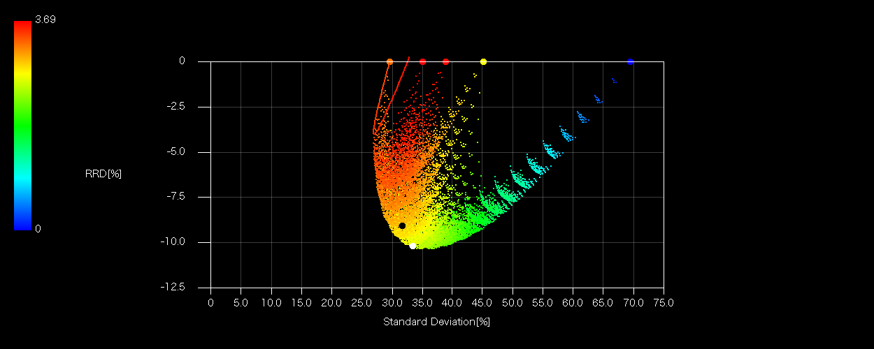 各プロットのX軸はシグマ(標準偏差)、Z軸(色)は加重平均配当利回り、ラインは全要素の有効フロンティア、ドットは5%ピッチSOBOLシーケンスによる総当たりマトリクスであり、組み合わせの数は5H20=24C20=10626通り。ドットに埋もれてしまうので均等配分(白丸)、加重配分(黒丸)は配当によらず色を変えています。