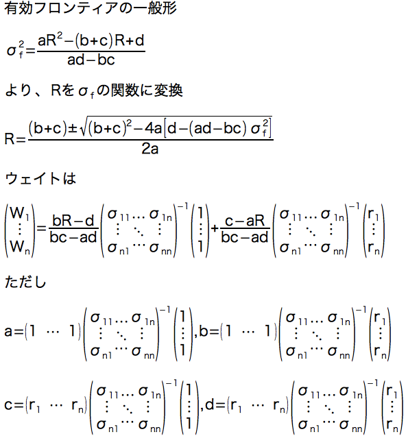 有効フロンティアについてII」で導出したR変数のパレート解においてRとσを入れ替えただけです。有効フロンティアは分散(バリアンス)とリターンの二次で結ばれているので、パレートウェイトを決める式のRをσで置換すればよいと考えました。
