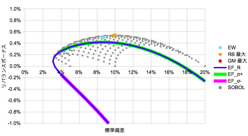 分散投資によるノイズキャンセル効果」で導出したリバランス・ボーナス(RB)最大ウェイトもあわせてプロットしています。特に相乗平均の方は有効フロンティアの極値(ピーク)に位置することが確認できます(現実的な解ではありませんが)。