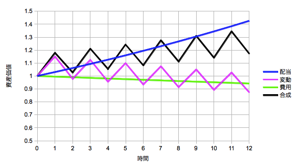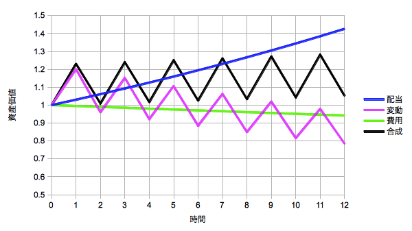 つまり、配当によって指数関数的に資産が上昇しても、市場変動によって相殺され、さらにコストが追い討ちをかけてしまうことを表現しています(ギザギザの下限と費用成分が重なっているのは配当と変動を略同等にしているからで、パラメータ次第で必ずしも一致するものではありません)。