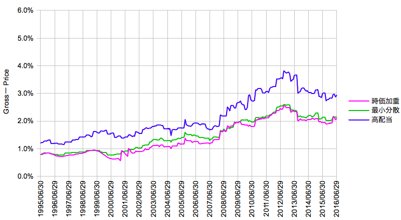 高配当は「High Dividend Yield」の名に恥じない高配当っぷりです。場合によっては時価加重や最小分散に対して年率1%超のオーバーとなるようです。また近年は全体的に配当が右上がりであることがわかります。