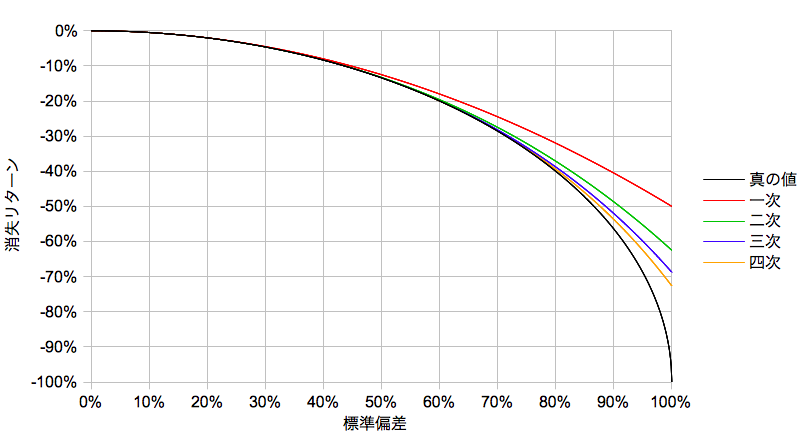 この近似式をもとに、横軸に標準偏差シグマを取り、冪級数展開の次数別にラインを分けたものが冒頭のプロットになります。σ=30%程度まではほとんど差がわかりませんが、シグマが大きくなるにつれて真の値と近似結果との乖離が大きくなることがわかります。通常のインデックス投資ではほとんどこの領域まで至らないとしても、個別株やレバレッジタイプによってはその限りではないと考えられます。