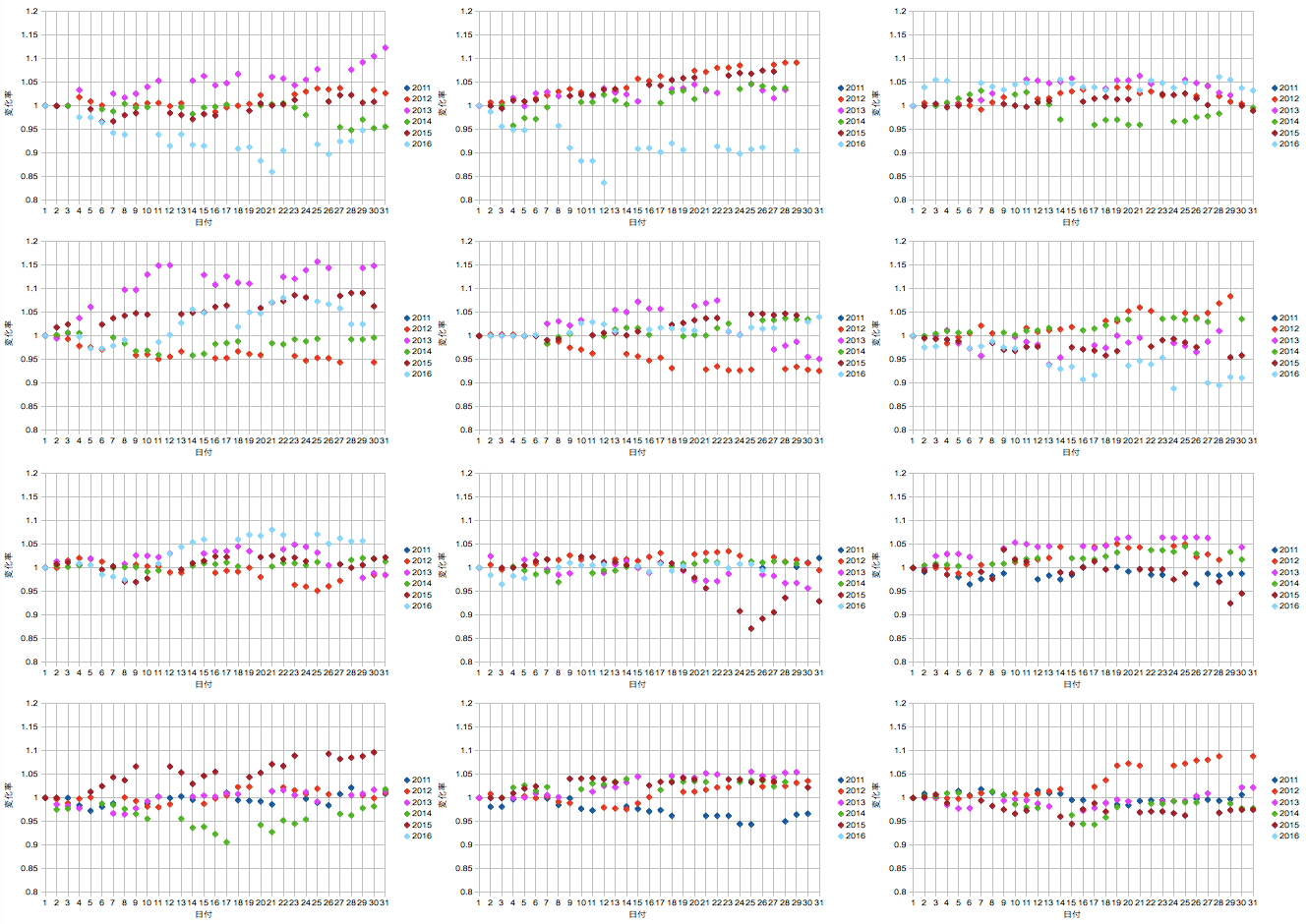 あと3月/9月に限らず全体的になんとなく月内で右上がりが多いような気がします。というのも2011年からのこの5年間は一方的に上昇した成分が支配的と思われるので、やはりもっと過去に遡って精度を上げたいところです。