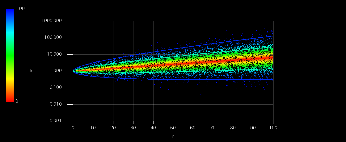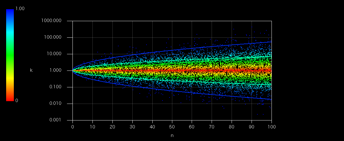 特定確率を示すラインは上から+2σ、+1σ、相加平均、0σ(相乗平均=中央値)、-1σ、-2σ。特に均等配分は相加平均(平均値)なので水平からひとつ上のラインとみなすことができます(つまりイコールウェイトのマイナスサムの確率は50%より低い)。