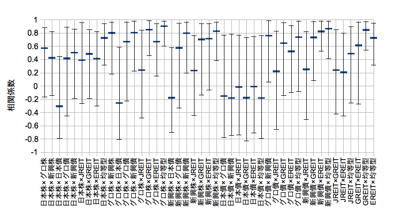 eMAXIS新興債開始の2010/09/13から。時系列上の20日移動相関係数の平均値をセンターとし、エラーバーにはその標準偏差とマックスミニマムを採用。新興RT(2013/11/18~)と均等型(2011/10/31~)はそれぞれの設定日から。