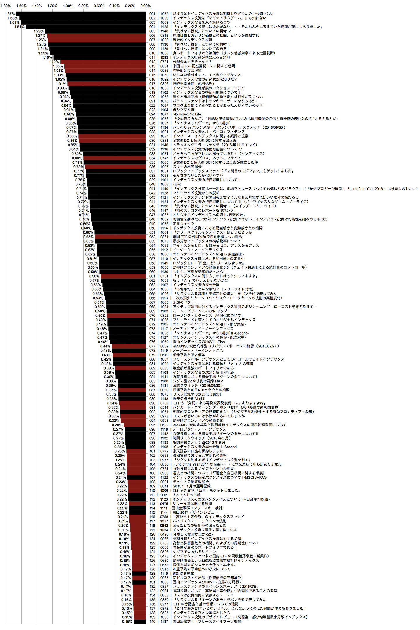 考察と並行して、インデックス投資の現状を把握するため、各記事のPV数を正確にカウントするよう2016/03/28(Entry/1055/)以降の記事を「つづきはこちら」形式で折りたたむようにしました。上のグラフは2016/12/27までのアクセス履歴のカウント数であり、バーの色は2016/03/28より古いか新しいかで切り替え。リストの下限は2016/03/28以降のアップ分がすべて含まれるまで抽出しています。ラベルは「通し番号|記事番号|タイトル」です。