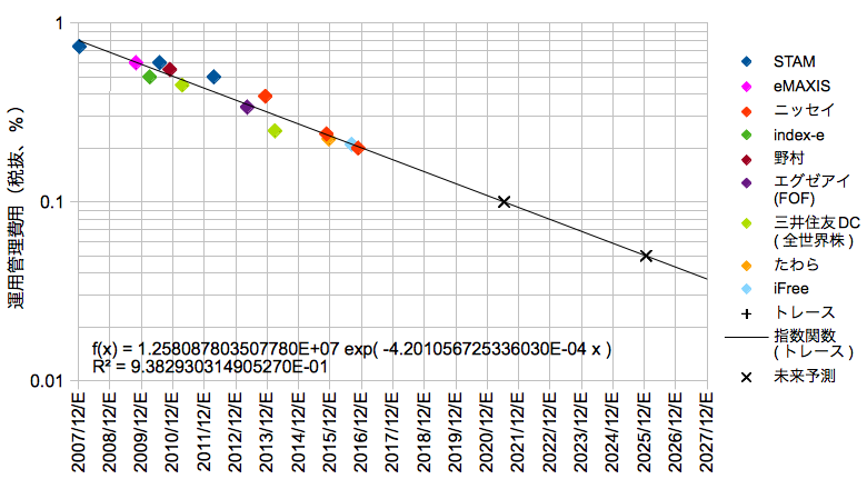 2016年末時点でミニマムが年率0.2%(税抜)。この法則が成り立てば、2021年中頃には0.1%、2026年初頭に0.05%、2036年中頃に0.01%に運用管理費用は低減していくことになります。