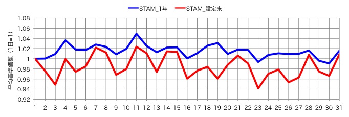 STAM新興株とeMAXIS新興株について、2011年6月24日までの直近1年間と設定来の、日付ごとの前営業日に対する平均騰落率と1日からの累積平均騰落率、および平均基準価額をプロットしました。参考までにVWOもやってみました。こちらはドル建てで終値です。