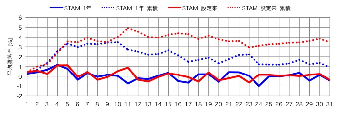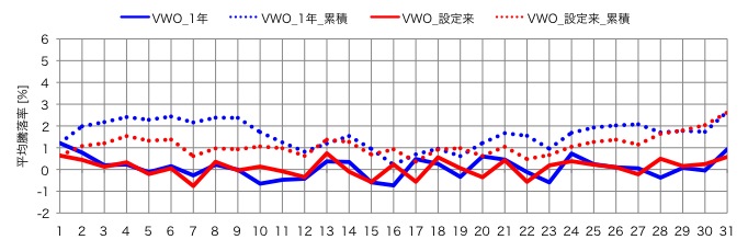 やはりというべきか、特にこの1年間は月末が有利な傾向があります。騰落率のSTAM/eMAXISとVWOとの差は為替でしょうか。だけどたぶん重要なのは実際の買付価格になる基準価額の方だと思います。