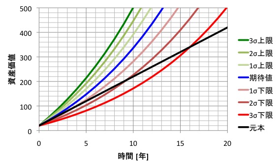 色の違いは元本と期待値(資産の中心値)、それから何σのバラツキを想定した場合の資産の上限と下限です。