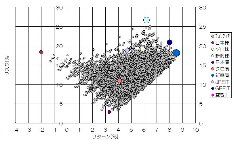 微妙な位置にいるのは好き嫌いやフィーリングで決めたものなので(´・ω・`)・・・実際のところパレート解に乗せるためには新興債と日本債主体にしないといけないのであまり現実的ではないです。