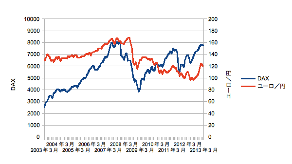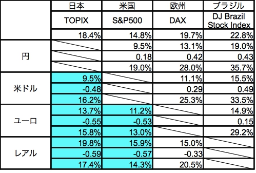 縦軸の通貨の国から見たときに横軸の国の株式リスクがどうなるか、という表です。2003/3から2013/3までを月単位で計算して年換算しています。欧州は代表してドイツ、新興国はブラジルとしています(ボベスパ指数でないのは諸般の事情)。