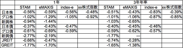 インデックスeとxx株式指数ファンドを追加しています。また3年を年率(複利)計算してから差分をとるように変更しています。さらに株式以外のベンチマークをSTAMに統一しました。