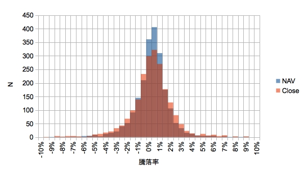 VWOのデータを眺めていて思ったことです。NAVとCloseそれぞれの日次騰落率のヒストを取ると以下のようになります(米ドル建て。2008/06/18の1:2分割は考慮。±10%を超える部分は非表示)。