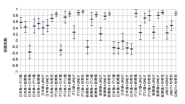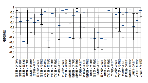 そのとき算出した相関係数について見てみたいと思います。eMAXIS均等型開始の2011/10/31から2013/8/30までのため、期間がまだ非常に短いことをご了承ください。相関係数は20日移動相関係数の平均値です。エラーバーにはその標準偏差と最大最小を採用します。