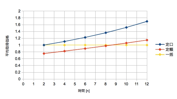 積立と言えば定額購入なので定口購入を選ぶケースは少ないと思います。よって、よく指摘される積立のデメリットは定額購入と一括購入との比較です。
