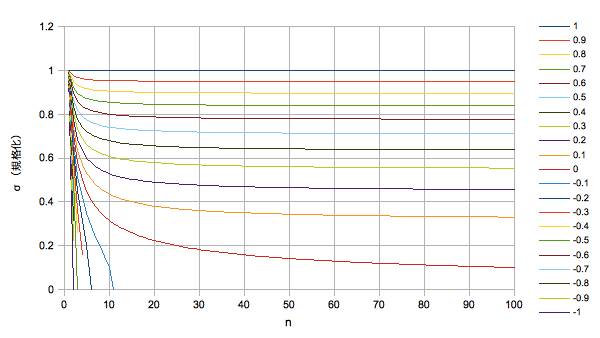 ある相関係数でnを増やしたときのσの減り方を見てみます。