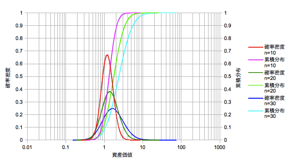 ではないと思うんです。ここで重要なのは確率密度の面積が確率に相当するということです。よって確率密度を資産価値で重みづけする必要がある気がします。つまり積立の確率密度はnを1ずつディレイした確率を積分してからトータルの資産価値で割り戻すと考えます。