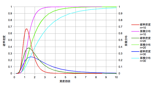 【時間リスクの確率密度と累積分布(対数正規分布)@資産価値(積立版)】