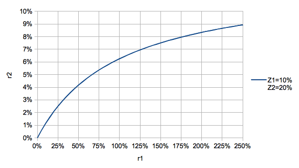 先日のクロス取引の式ではr1によらなかったのに対してこちらはr1の関数になります。例えば税率が10%から20%になるとしてプロットしてみると、