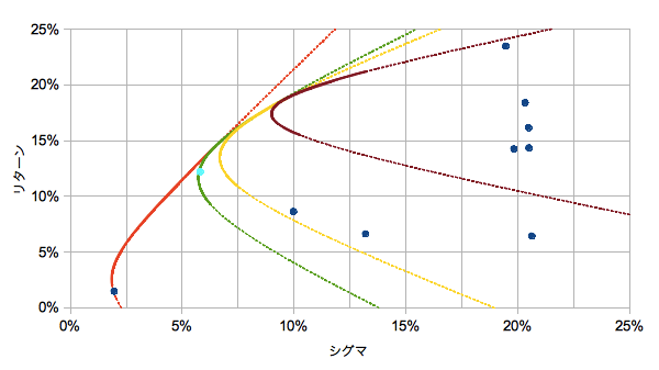 それぞれ以下の有効フロンティアを表します。緑色が左下(日本債)を除く8資産、黄色がリターンの下から3つ(日本債、新興債、新興株)を除いた6資産、茶色がリターンの下から4つ(日本債、グロ債、新興債、新興株)を除いた5資産です。