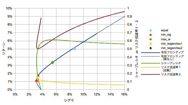 黄色の曲線はシグマに対するリスク低減率1で、これが最大(数値が大きいため便宜的に逆数にしています)の位置かつ有効フロンティア上に黄色の点があることがわかります。