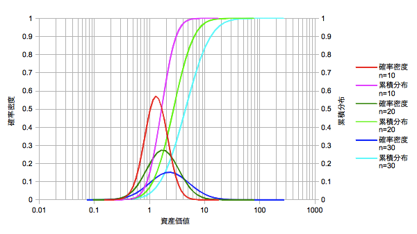 【確率密度と累積分布の資産価値依存】