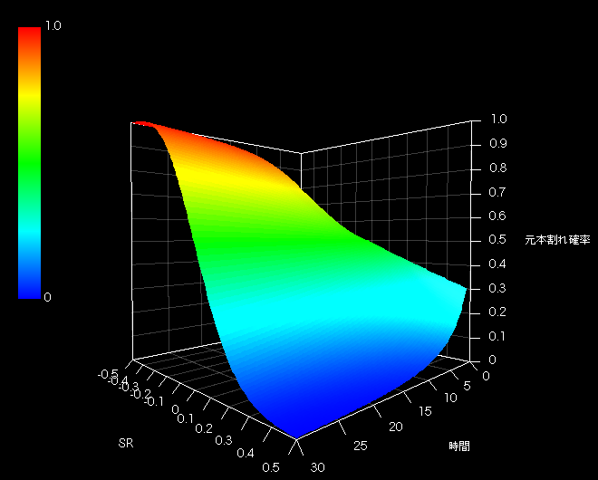 また平面図やテーブルからわかるように元本割れ確率はSR=0(相乗平均リターンがゼロ)を軸として対称(奇関数)です。