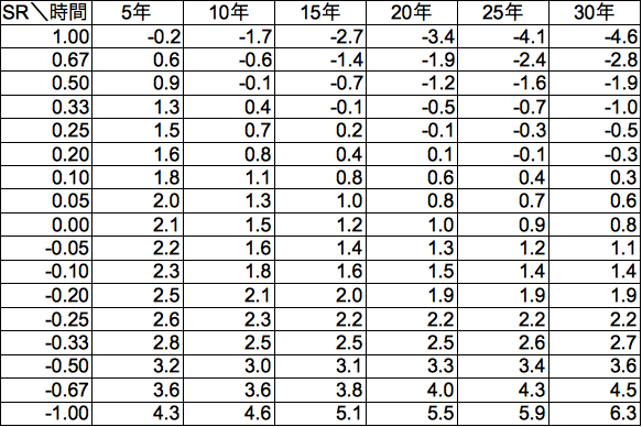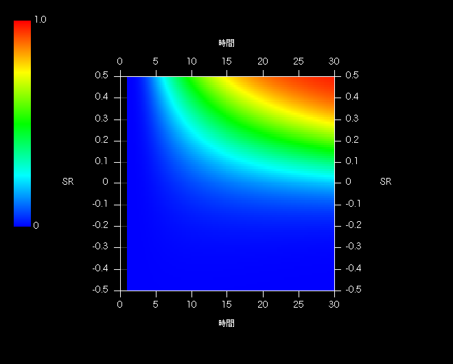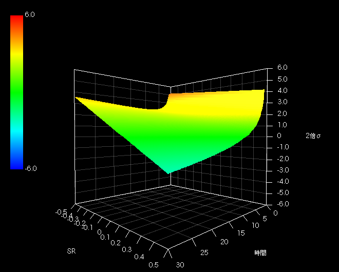 また元本割れ確率と違って2倍確率はSR=0を軸に対称ではありません。より大きなSRと時間が求められるという結果です。定量的にはSRは「μ/σ=ln2/(σn)」だけシフトします。