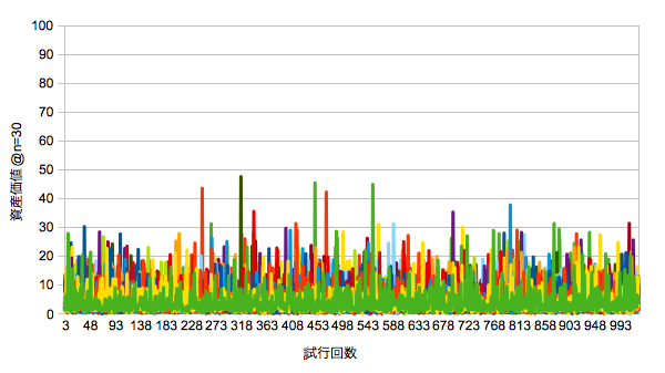 30年後の資産価値のバラツキを考えます。方法は次の通りです。