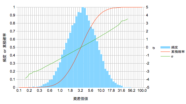頻度は資産価値を1dB(デシベル)ごとに分割して求めています。つまり対数なので横軸リニアのままで正規分布の形になります(最頻値が求められませんが)。また頻度は最大値を1として規格化してあります。累積確率は頻度を資産価値の低い方から積分し16384で規格化しています。