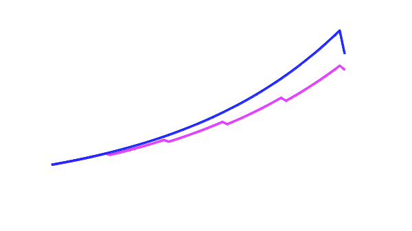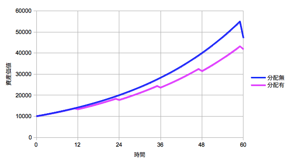 分配の度にその期間内の収益を確定させ税引後の残りを再投資するとマゼンタ色のギザギザの線になります。一方青色の線は分配無しで最後まで引っ張り最後に売却して元本との差額が徴収された結果になります。