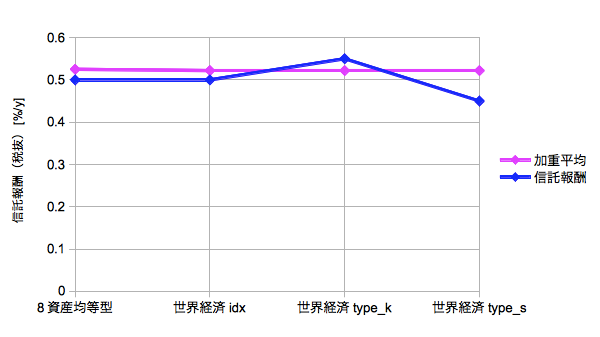 世界経済type_k/type_s(株式シフト型/債券シフト型)は、グロ株/グロ債のように同じ信託報酬の対となる資産間でウェイトを非対称にしているだけなので加重平均としては元の世界経済idxと変わりません。それに対して信託報酬を差別化しているので折れ線グラフのようにねじれが発生しています。こうやって見ると世界経済type_sがかなりいい感じです。グロ債好きの方には朗報かと思います。