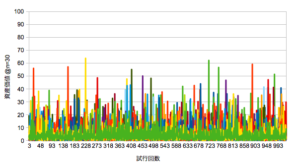 30年後の資産価値のバラツキを考えます。方法は次の通りです。