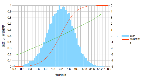 ちなみに資産価値0.05ピッチでリニアに分割した場合のヒストグラムは以下のようになります。