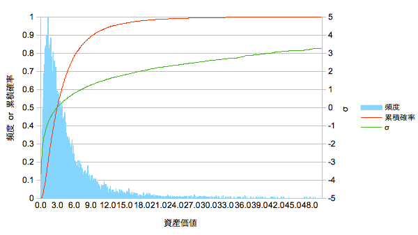 頻度は資産価値を1dB(デシベル)ごとに分割して求めています。また頻度は最大値を1として規格化してあります。累積確率は頻度を資産価値の低い方から積分し16384で規格化しています。