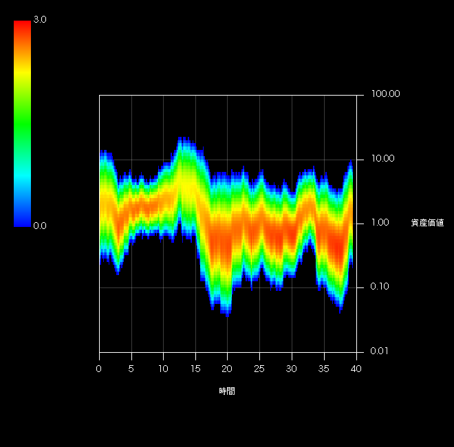 この海底山脈のような分布がリスクの時間変化を表します。MSCI JAPANの1969/12/31から2014/06/30までのMonthly/Gross時系列をベースとしています。5年間の年率リスクリターンから5年後の時間リスクの確率密度を求め、それを1ヶ月ずつ時間軸方向にずらして描画した474本(39.5年)のラスタースキャンです。ある時刻におけるスライス1枚1枚が確率密度に相当します。時間軸は1974/12/31をゼロとして年単位でスケールしています。