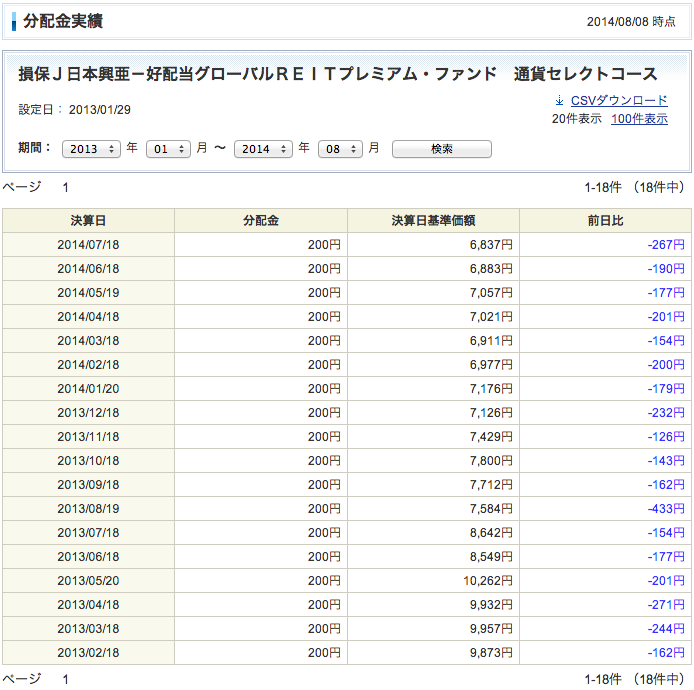 何でもいいんですが、以下は『毎月200円(一万口当たり課税前)もの高分配を2013年2月以降17ヵ月連続で出している』という「好配当グローバルREITプレミアム・ファンド 通貨セレクトコース」の「分配金実績」です。