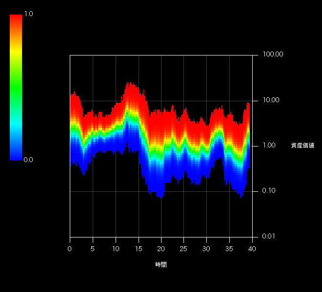 この大陸棚のような分布がリスクの時間変化を表します。MSCI JAPANの1969/12/31から2014/06/30までのMonthly/Gross時系列をベースとしています。5年間の年率リスクリターンから5年後の時間リスクの累積分布を求め、それを1ヶ月ずつ時間軸方向にずらして描画した474本(39.5年)のナイアガラです。ある時刻におけるスライス1枚1枚が累積分布に相当します。時間軸は1974/12/31をゼロとして年単位でスケールしています。