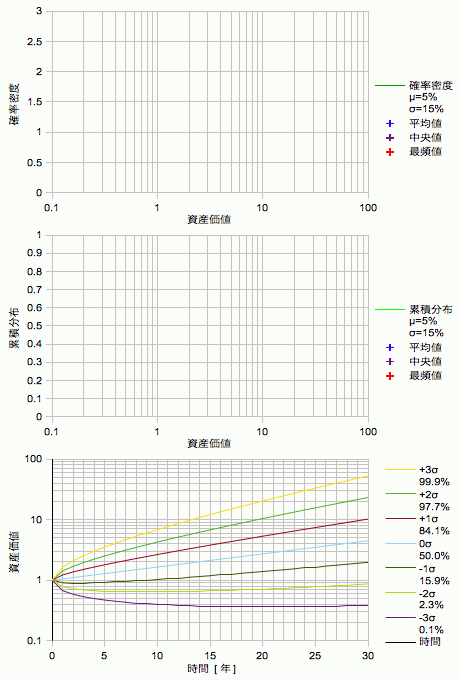 ・確率密度、累積分布とも資産価値の範囲が広がっていく=長期投資で不確定性は増大する