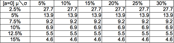 例えばμ=5%、σ=15%、0σの確率(50.0%、a=0)で2倍になるために必要な時間は